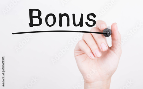 © Studio Nova, Fototapeta premium Hand writing Bonus with black marker on transparent wipe board