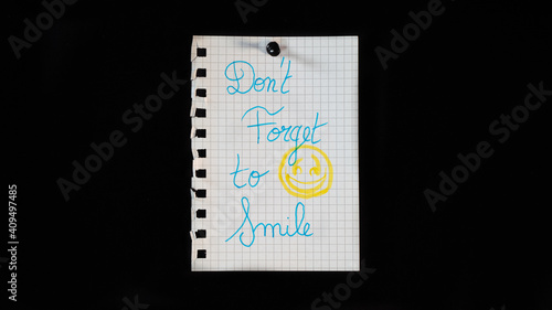 Fototapeta premium Hand written message on a ripped notebook sheet, "Don't forget to smile"