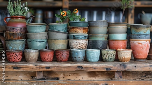 © subur, Fototapeta premium Handcrafted Ceramic Bowls Displayed in a Rustic Setting