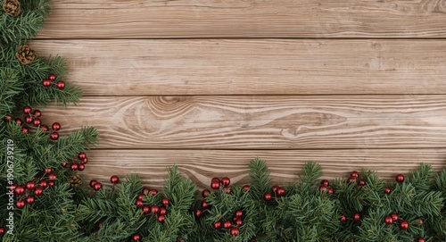 © AkuAku, Naklejka premium Handcrafted Christmas garland draped over natural rustic wood background with space