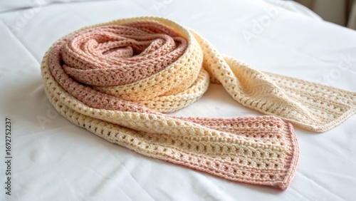 © Daniel, Fototapeta premium Handcrafted crochet scarf in warm pastel tones for fashion accessories