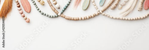 © Юля Бурмистрова, Fototapeta premium Handcrafted fiber art necklace showcasing vibrant colors and intricate textures on a minimal backdrop