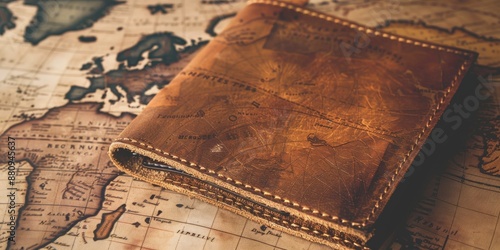 Obraz premium Handcrafted leather wallet on a vintage map, blending style and functionality, captured with a keen eye for texture and material quality