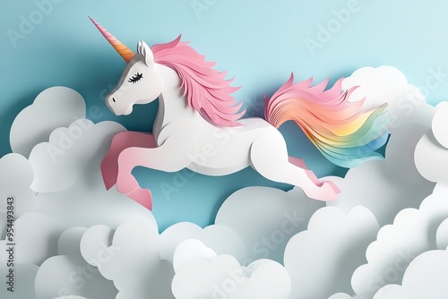 © Niken, Fototapeta premium Handcrafted paper unicorn model in three dimensions, featuring pink body, white head, Rainbow mane and tail depicted leaping over white clouds. Generative Ai