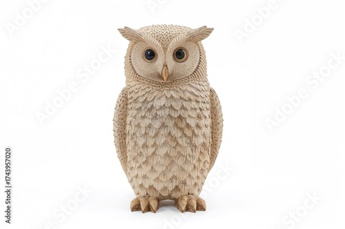 © Giovanni, Naklejka premium Handcrafted wooden owl sculpture from Strigiformes, isolated on a white background with copy space. Front perspective.