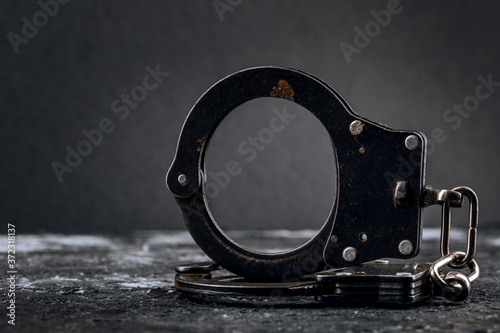 © fusssergei, Obraz premium Handcuffs on a dark background. The concept of crime and police.