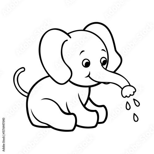 Naklejka premium Handdrawn Cartoon Elephant Sitting Spraying Water from Trunk with Droplets in...