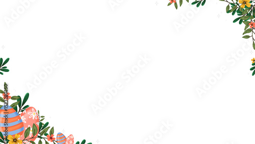 Fototapeta premium Handdrawn Easter border is featuring pastel eggs, flowers, foliage, stars, transparent copy space