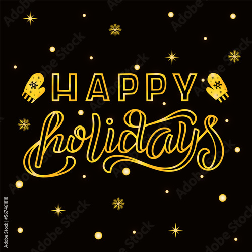 Fototapeta premium Handdrawn vector illustration with golden lettering on textured background Happy Holidays for winter season greeting, invitation, celebration, advertising, poster, card, banner, print, label, template