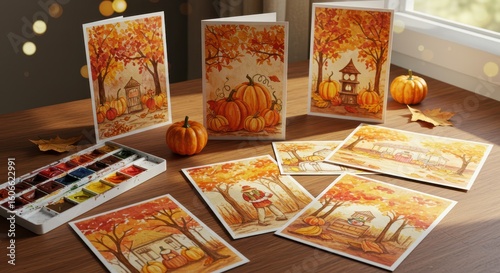 Obraz premium Handmade autumn greeting cards displayed on wooden table with pumpkins