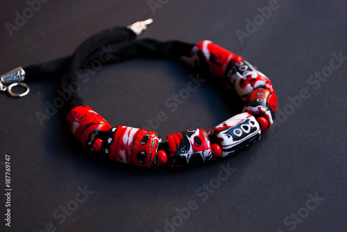 © Etnika, Fototapeta premium Handmade jewelry from polymer clay. Beautiful bright necklace on black background. Fashion foto. Bijouterie in macro. Black and red collar.