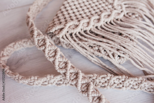 Fototapeta premium Handmade macrame cotton сross-body bag. Eco bag for women from cotton rope. Scandinavian style bag. Beige tones color, sustainable fashion accessories. Details. Close up image