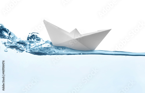 © New Africa, Obraz premium Handmade paper boat floating on clear water against white background