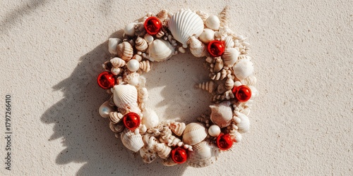 © MNStudio, Fototapeta premium Handmade wreath of seashells and red ornaments lies on sandy beach background. A tropical twist on traditional Christmas decor for coastal holiday vibes.