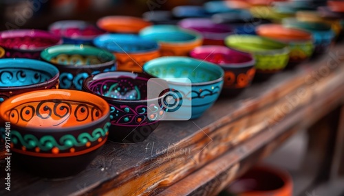 © Nawarit, Fototapeta premium Handpainted ceramic bowls, artistic and vibrant, Artisan, Bright hues, Photograph, Craftsmanship