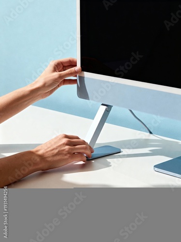 © Anna, Fototapeta premium Hands adjusting blue desktop computer monitor stand on white desk. Person tilting screen for better ergonomics in modern office