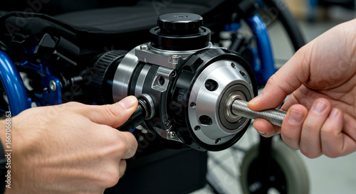 © Guilherme, Obraz premium Hands assembling motor unit on wheelchair frame