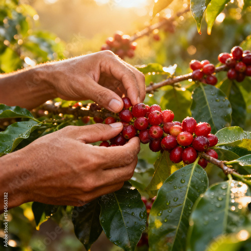 © Yuliya, Obraz premium Hands carefully selecting and picking ripe, vibrant red coffee cherries from branch on lush, sun-drenched coffee plant during a beautiful morning harvest.