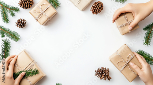 Obraz premium Hands carefully wrapping Christmas gifts with eco-friendly paper and twine, symbolizing sustainability, mindfulness, and conscious gifting. The warm atmosphere reflects holiday spirit and environmenta