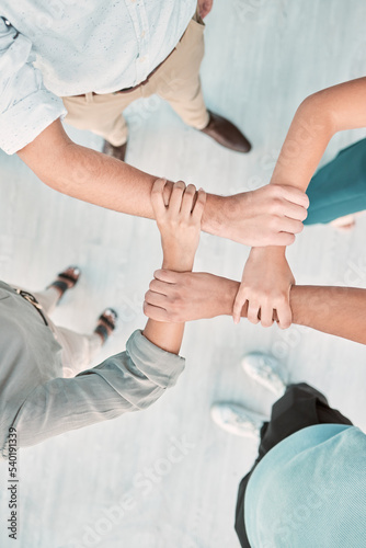 Obraz premium Hands, collaboration and unity with a business team holding arms in an office together from above. Trust, support and teamwork with a man and woman employee group standing in solidarity or faith