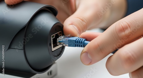 Fototapeta premium Hands connecting an Ethernet network cable into a security camera or surveillance device, highlighting the installation process for modern technolo...