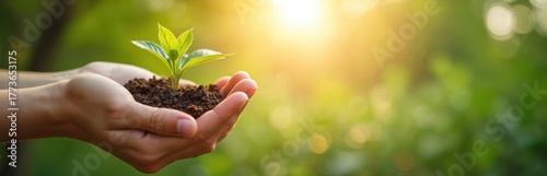 Naklejka premium Hands cradle new plant sprout in rich soil, sunlit green leaves grow. Nurturing nature, future life, and climate action. Farming, garden, hope, eco balance.