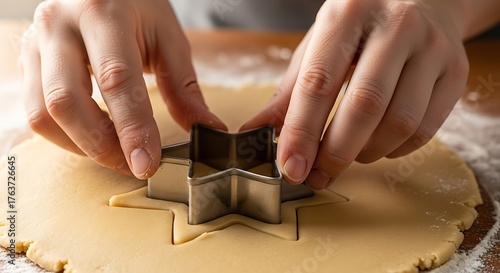 © Octopus16, Fototapeta premium Hands Cutting Cookie Dough with Star Shaped Cutter in Kitchen