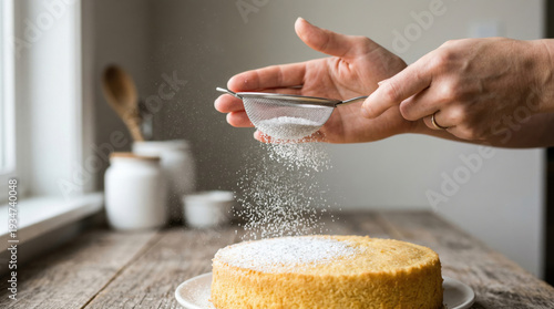 © Александр Марченко, Obraz premium Hands dusting cake with powdered sugar using sieve
