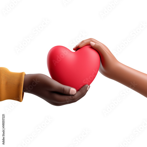 Obraz premium Hands exchanging a red heart symbolizing love and connection between diverse individuals on white or transparent background