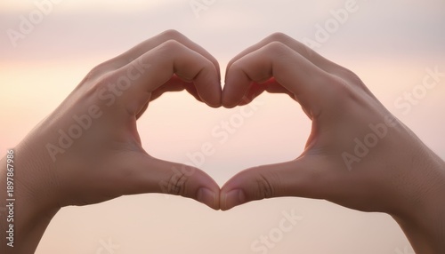 Fototapeta premium Hands forming a heart shape against a serene sky at sunset, symbolizing love...