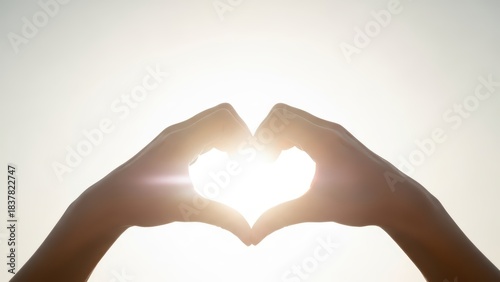 Fototapeta premium Hands forming a heart shape against the bright sun, symbolizing love, hope, and connection in a warm, glowing light