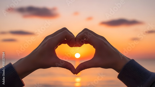 © MDNAZRUL, Fototapeta premium Hands forming a heart shape around the sunset