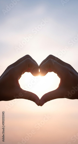 © Cozy Art, Fototapeta premium Hands forming heart shape against sunset sky with sunlight