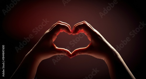 Fototapeta premium Hands forming heart shape with dramatic backlighting and soft red gradient