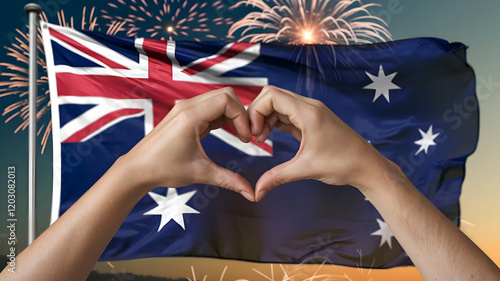 Naklejka premium Hands Forming Heart with Australian Flag and Fireworks