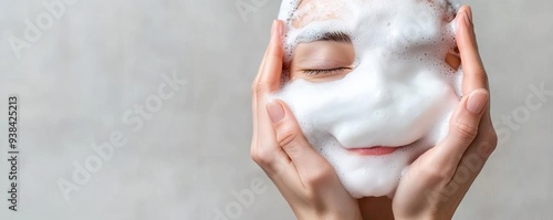 © Design@22, Naklejka premium Hands gently applying facial foam with soft lather, skincare routine, clean and smooth