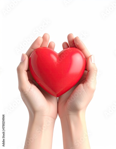 Fototapeta premium Hands gently cradle a bright, glossy red heart shape
