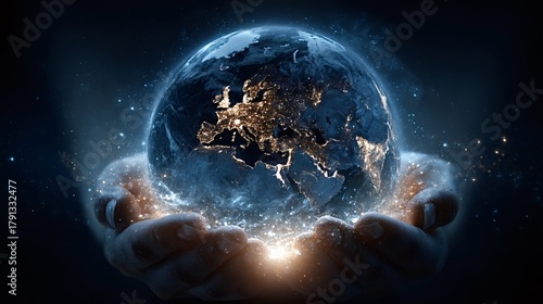 Fototapeta premium Hands gently cradling a glowing planet earth, depicting care, environmental...