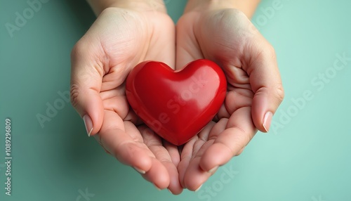 Fototapeta premium Hands Gently Cradling a Small Shiny Red Heart with Affection.