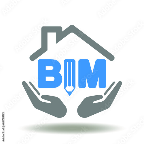 © wladimir1804, Fototapeta premium Hands hold roof build and BIM acronym with pencil vector icon. Building Information Modeling Symbol. Construction Architecture Technology Illustration.