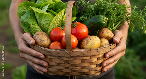 Fototapeta premium Hands holding a basket of fresh organic vegetables, with visible soil and leaves