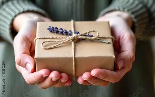 © wu, Fototapeta premium Hands Holding a Brown Paper Gift Box with Lavender and Hemp Twine. High quality