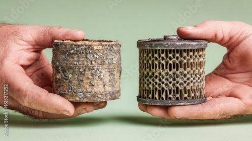Fototapeta premium Hands holding a clogged filter cartridge next to a new one, showing how...