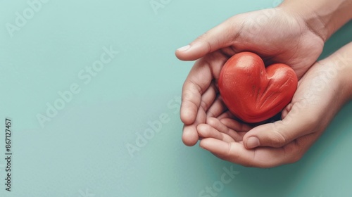 © vanzerim, Fototapeta premium Hands Holding a Red Heart on a Light Blue Background