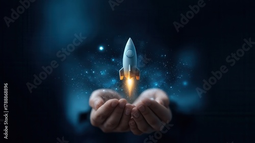 Fototapeta premium Hands Holding a Small Rocket Launching Into Space Surrounded by Stars and Light
