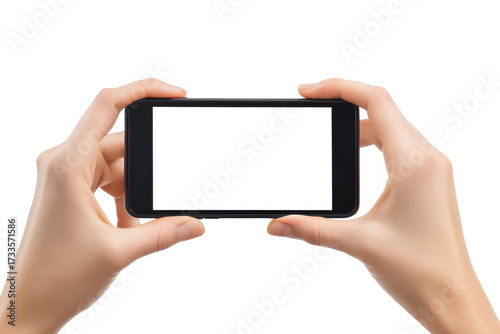 © MD USUB BISWAS, Fototapeta premium Hands holding a smartphone horizontally with a blank screen isolated on transparent background. Mobile phone mockups set smartphone screen mockup frame in hand isolated on white background.
