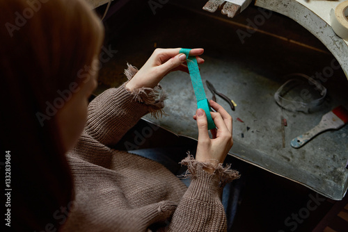 © Seventyfour, Obraz premium Hands holding and examining small hand tool over a cluttered workbench with various tools visible in the background and clipboard attached at side