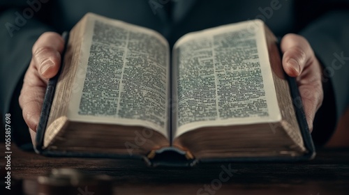 Obraz premium Hands Holding Open Old Book with Text