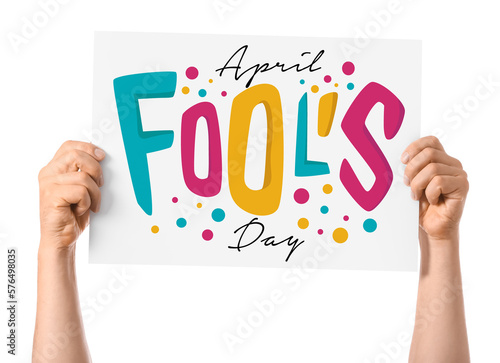 © Pixel-Shot, Fototapeta premium Hands holding poster with text APRIL FOOLS DAY on white background