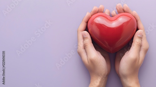 © Teerapat, Fototapeta premium Hands Holding Red Heart Symbol on Soft Lavender Background